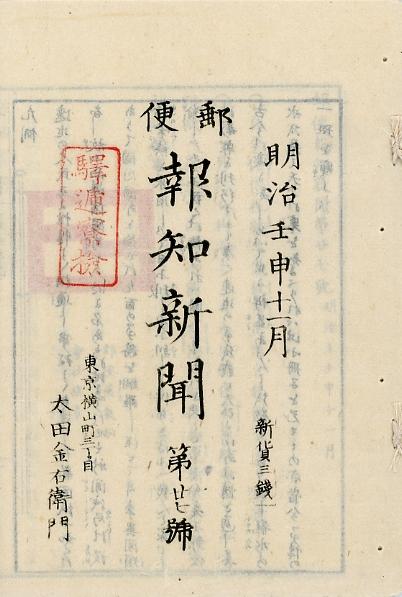 This and other early issues were published as woodblock pamphlets by Ōta Kin'emon until the founding of the company Hōchisha the following year. "Yūbin" was dropped from the name of the paper from the 1894-12-26 issue.