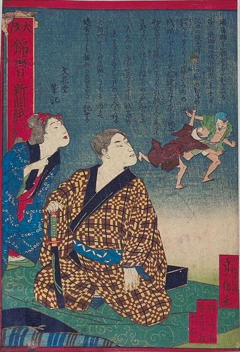 As a result of the above crackdown, Osaka news nishikie publishers had to disclose their own names, and the names of writers, on their prints. Apparently some also had to suppress the word "shinbun" from the titles of their prints, and even from the names of the "news bureaus" within their companies.