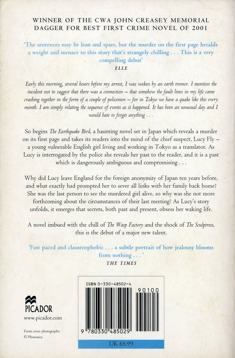 Susanna Jones 2001, 2019The Earthquake BirdThis story, involveing the disappearance and apparent murder of a British woman in Japan, and the police investigation of her best friend, another British woman in Japan, is linked from Backpackers, sojourners, settlers page. Partly due to the impact of the 2019 film adaptation of The Earthquake Bird, the 2001 novel has been published in numerous languages, and in a new 2019 tie-in edit. English editionsSusanna Jones Japanese translationHardcoverスザンナ・ジョーンズ (著) Suzanna Joonzu (Susanna Jones) (author) Paperbackスザンナ・ジョーンズ (著) Suzanna Joonzu (Susanna Jones) (author) This movie tie-in editon retitles "Earthquake Bird" as "Earthquakebird". Chinese translation蘇珊娜 瓊斯 (Susanna Jones) Korean translation수재나 존스 (Susanna Jones) European translationsDove la terra trema Wo die Erde bebt L'Oiseau-tempête La musica del terremoto Jordskalvs fågeln Proof copyAn uncorrected proof copy offered for sale by an used book dealer devotes the front cover to an attractive photo of the author. A blub on the cover bills the novel "A crime debut as chilling as The Wasp Factory and as shocking as The Sculptress" -- publicity bumped to the back of the first paperback edition. Having read neither of these chilling and shocking novels, I can only say that I didn't find The Earthquake Bird particularly chilling or shocking. Several decades of observing the human condition, in real life and fiction, have taught me that the depths of human psychological and social pathology unfathomable. That being said, how can a reader possibly be chilled or shocked by something after being told one will be? The storyA body believed to be that of Lucy Fly's missing friend Lily Bridges is found in Tokyo Bay. Police conclude they need to interrogate Lucy as the last person who seems to have seen Lucy alive. Two officers escort Lucy from her place of work to a police station, where a detective interrogates here. Lucy, who is narrating her own story, plays cat and mouse with the police -- telling the reader she is fluent in Japanese, but letting the police think she needs an interpreter -- until the interrogator, through the interpreter, extracts from her the truth of the matter (page 7, hardcover edition) 'And you work in Tokyo, in Shibuya,' the old, fat policeman says in Japanese. When it's relayed into English, I reply, 'That's right.' As I read this, I kept wondering whether readers would get off on Lucy's attitude toward the police, given her situation. The entire story unfolds like this. Lucy knows everything about her own past and recent circumstances. But she seems to think that the police are not very bright, as they have brought her in from questioning from her place of work as a translator of Japanese to English -- yet assume that she, being a foreign in Japan, though for 10 years, can't speak Japanese, or at least not well enough for the purposes questioning her about Lily disappearance and apparent murder. Lucy makes the job of the police -- and her own position -- as difficult as possible by limiting her revelations only to matters they directly inquire about. Rather than help the police understand who she is, if only to eliminate herself from the top of their list of suspects, she strings both the police and readers along -- until it conveniences her psychological-thriller plot to reveal more. The police case against Lucy is based entirely on circumstancial evidence -- which of course Lucy understands, as she protests her innocence to the police. But she also leaves readers puzzled -- though, of course, to keep readers a bit off balance is the whole purpose of writing a novel like this. Not until the second to last of the novel's 15 chapters, written in sparkling prose, does hard evidence surface that Lucy could not have killed her friend -- despite the fact that she appears to have had both a strong motive and ample opportunity. Lucy confides in the reader -- "No, I didn't kill Lily. Lucy is innocent of murder and guilty only of spinning a story." Yet she continues to toy with the reader, as she wonders "how innocent am I? How not guilty?" -- and imgines herself, if prosecuted, entering a plea like this (page 202). Not guilty, but how not guilty. Not entirely guilty but not entirely innocent. The truth may [come] out in the trial, but for now I'll be the murderer. As literatureThe authors of most "Japan novels" written in English seem to feel obliged to teach readers about Japan. Thankfully, Jones suppresses, better than writers of most such fiction, the urge to explain things Japanese. There are comparatively few language lessons like "pera pera / fluently". Jones gives several paragraphs to a bathing scene at a hotsprings, in which she describes how to take a communal bath. But there are fewer such tourguide-esque asides than I expected. This may be one reason The Earthquake Bird, as a novel, ranks a bit higher on the literary scale than most Steamy East fiction. Another reason, tough, is its clean, very readable prose. The Earthquake Bird won the 2001 John Llewellyn Rhys Prize for the best literary work by a British Commonwealth writer 35 years old or younger, written in English and published in the United Kingdom. It also won the 2001 Crime Writers Association's John Creasey Memorial Dagger for best first crime novel. The movieThe Earthquake Bird was made into a film directed by Wash Westmoreland (b1966) and produced by Ridley Scott (b1937), both of whom are British. Westmoreland had lived in Japan in 2016 as a foreign student at Fukuoka Daigaku. He liked Japan, and the opportunity to direct the film enabled him to come back. The film features the Swedish actress Alicia Amanda Vikander (b1988) as Lucy Fly. She crammed for 8 weeks before the start of production to enable her to speak her lines in Japanese, and they come across as very fluent. She is, however, possibly trimmer and more attractive than Lucy Fly in the n