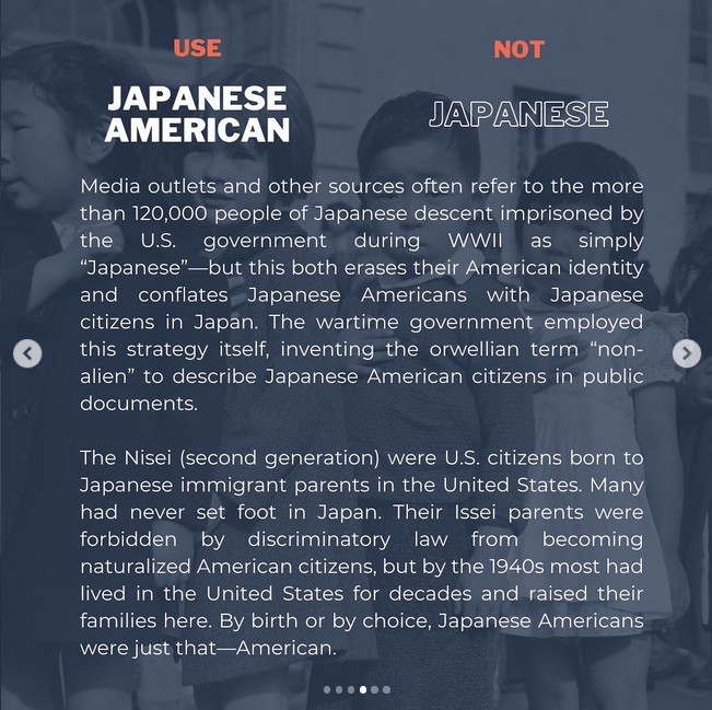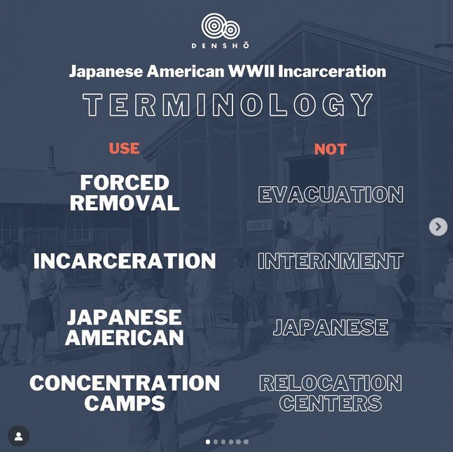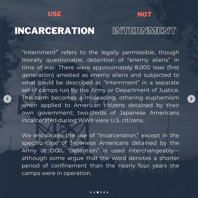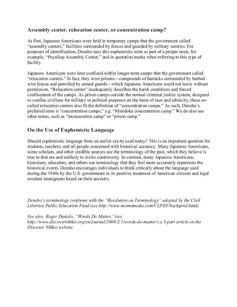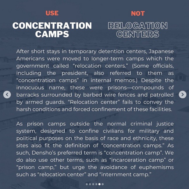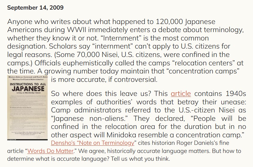 1 February 2008 Part 1 of 5 The following year, Densho invited visitors to discuss Daniels' article as a step toward developing a terminology guide (see image to right). Densho's note on terminology (2016)By 2016, Densho was publicizing terminogy recommendations, reflecting its "critical" understanding of the evacution and relocation experiences of "all persons of Japanese ancestry" during the Paficic War (see image to right). Over the years, Densho has refined its terminology recommendations and shared them on social media. Densho's content includes personal testimony and opinion, and jounalistic and academic topical reports that vary in quality from very high to rather low. Not all content contributors follow Densho's terminology recommendations, but many do. Elsewhere, Densho's guide to Japanese American WWII Incarceration Terminology (below) on "euphemisms" -- and other officialese it regards as deceptive or wrong -- has influenced, and distorted, the ways many writers have chosen to characterize the U.S. government's wartime removals of "all persons of Japanese ancestry" from the west coast exclusion zones to inland relocation camps. |