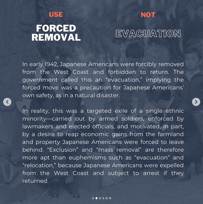 False metaphors vs. officialeseDensho has posted different versions of its terminology guide on social media. It has, for instance, an Instagram page called denshoproject, which publicizes various Densho projects, including a Japanese American WWII Incarceration Terminology guide it shares with publichistorians, the Instagram page of the National Council on Public History (NCPH), which has the following mission (as of 15 August 2025). NCPH inspires public engagement with the past and serves the needs of practitioners in putting history to work in the world by building community among historians, expanding professional skills and tools, fostering critical reflection on historical practice, and publicly advocating for history and historians. The keyword here is "critical reflection". And the terminology issues Densho raises regarding the history of the Pacific War removal of "all persons of Japanese ancestry" from designated west coast military exclusion zones, are raised from the standpoint of "critical scholarship" -- which focuses on issues like power, inequality, social justice, and a litany of related topics, in the interest of challenging and reconstructing conventional wisdom and the status quo. The main problem with "critical scholarship" is that it tends to put theory, which is likely to reflect a political ideology, before careful discovery and analysis of facts. Critical scholars seek to revise history in accordance with their preconceived notions "truth". For sure, all histories press one or another view of the human condition into the service of a world view. An no history is immune from revision. The only question in scientific historiography is whether a revision improves the truthfulness of history by introducing new facts or more credible versions old facts, or higher quality analysis. Critical historians rewrite received histories -- which full of biases, euphemisms, and silences -- to reflect, they argue, other voices, which they believe tell truer stories about the past. If done with respect for facts, critical histories can definitely be truer. But if inconvenient facts are ignored, or subverted by ideology, the results are analogous to painting a lidded garbage can with flowers and believing it is a flower garden. Some efforts to write the "euphemisms" out of the received official accounts of the evacuations, relocations, and other dispositions of "all persons of Japanese ancestry, both alien and non-alien" during the Pacific War, amount to subordinating history to ideology rather than facts. "words can lie or clarify"Densho Project (Instagram), in collaboration with Public Historians (Instagram, National Council on Public History"), offers this pretext for revising terminology (retrieved 15 August 2025). In the words of Aiko Herzig-Yoshinaga, a camp survivor who would go on to play a pivotal role in obtaining redress for Japanese Americans, "words can lie or clarify." When we use language that distorts the past, we lose our ability to recognize patterns of repeating history. But language that imparts truth and understanding can help us avoid repeating those same mistakes today. The problem is when the "clarifications" themselves mask and muddy the underlying truths that, because they are redressed in ideologically comfortable clothing, cannot be understood in a way that is likely to realize the dream of not repeating the past. The allegation that words like "evacuation" and "relocation" are somehow "lies" -- and that "forced removal" and "incarceration" are truthful clarifications -- is extremely problematic. It assumes that the government officials who used "evacuation" and "relocation" were "lying" or otherwise intended to mislead the public as to the intentions of the removals of "all persons of Japanese ancestry" from the west coast exclusion zones. But in fact, "evacuation" and "relocation" are arguably the best and most truthful terms possible. "Forced removal" fails to properly characterize the evacuation -- which would have been impossible without the peaceful cooperation of the evacuees. "Incarceration" totally obscures the purpose of the removal -- to relocate evacuees elsewhere in the United States. |